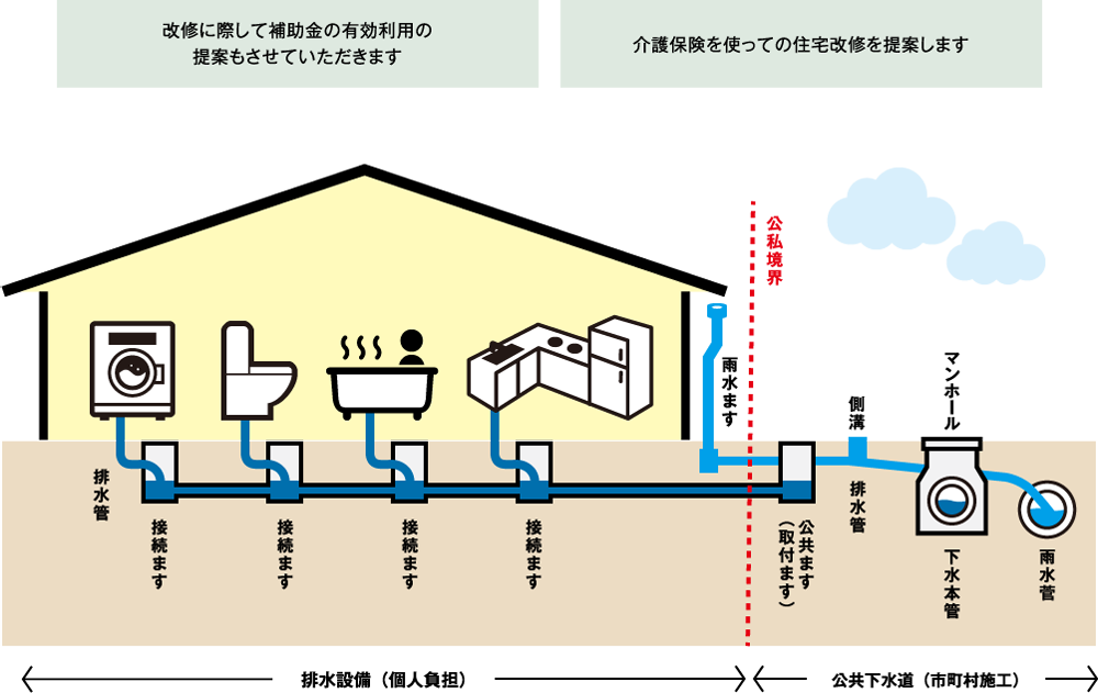 水洗トイレからのし尿を排除するために宅地内に汚水ますや配水管を設置する技術です。